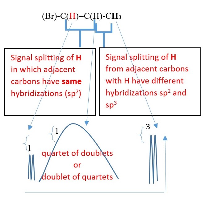 other possibilities. in this case but the actual signal can even be more complex than the above three because the central proton is chiral and can split the –CH3 proton signal into different separate signals. In addition, the left –CH2- can also be split into separate cis and trans signals.