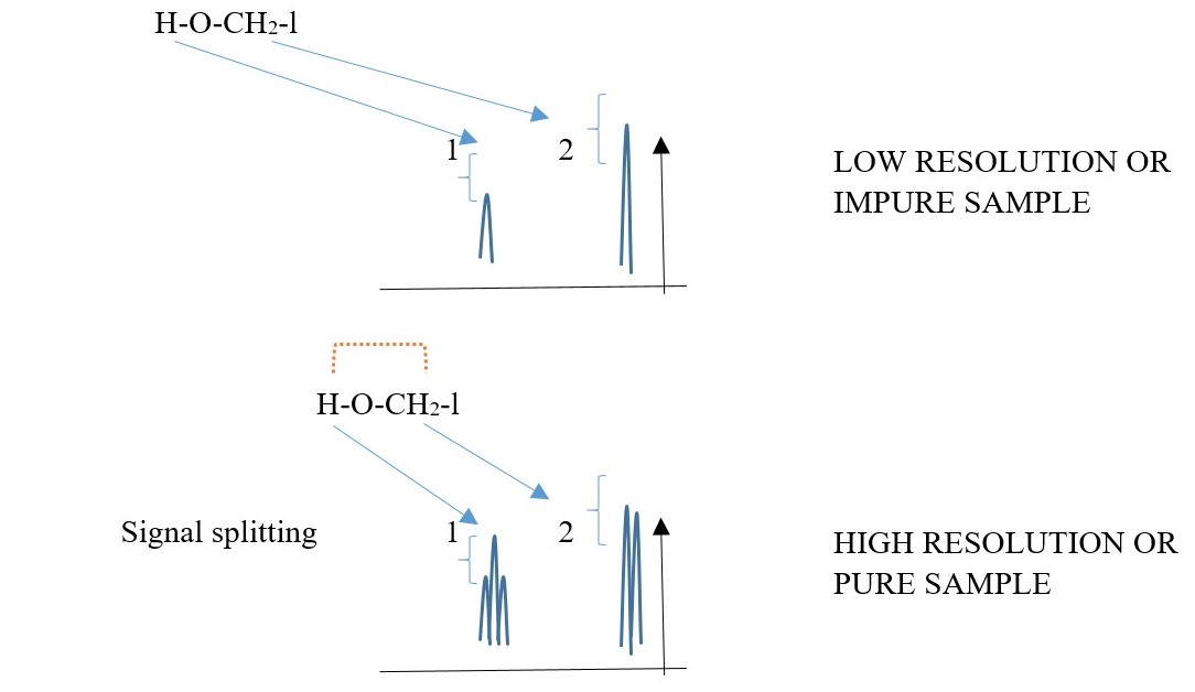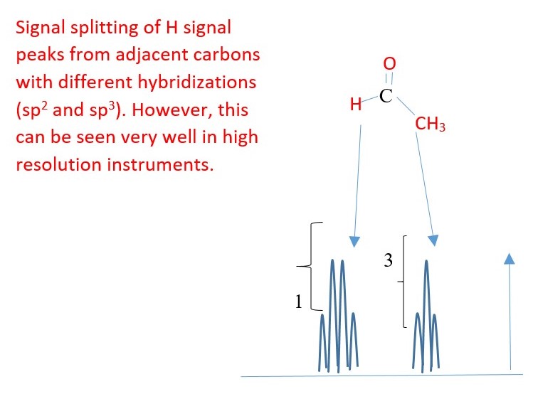 Magnetic effect from spin relaxation of a proton in a different chemical environment is different can interact with the magnetic effect of a proton spin on adjacent carbon of different chemical environment. This interaction called SPIN Coupling causes the splitting of the total magnetic effect of the proton spin relaxation into multiples of signal peaks in the NMR spectrum. Number of peak signals corresponds to the number of protons on the adjacent carbon of different chemical environment.