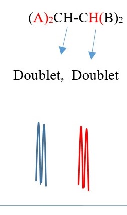 TWO protons near A chemical environment are equivalent and homotopic and interact with the signal of the single non-equivalent proton [N=1] on adjacent carbon near B chemical environment to give a multiplicity peak signal of [ N+ 1 = 1+1 = 2] = DOUBLET. However, the proton near B also sees a single non-equivalent proton near A chemical environment and the interaction splits the signal peak into a multiplicity peak signal of [N+ 1 = 1+1 = 2] = DOUBLET of a different chemical shift.
