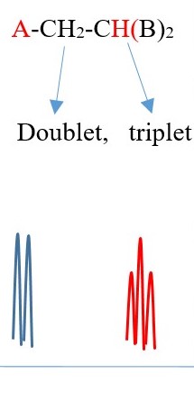 TWO protons near A chemical environment are equivalent and homotopic and interact with the signal of the single non-equivalent proton [N=1] near B chemical environment to give a a multiplicity peak signal of [N+ 1 = 1+1 = 2] = DOUBLET. However, the proton near B also sees two non-equivalent protons [N=2] near A chemical environment and the interaction splits the signal peak into a multiplicity peak signal of [N+ 1 = 2+1 = 3] = TRIPLET with a different chemical shift due difference in the chemical environment.