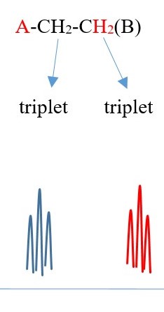 TWO protons near A chemical environment are equivalent and homotopic and interact with the signal of the TWO non-equivalent protons [N=2] on adjacent carbon near B of different chemical environment to give a multiplicity peak signal of N+ 1 = 2+1 = 3= TRIPLET. However, the 2 protons near B sees a two non-equivalent protons [N=2] on adjacent carbon near A chemical environment and the interaction splits the signal peak into another multiplicity peak signal of [N+ 1 = 2+1 = 3 ]= TRIPLET of a different chemical shift due to difference in chemical environment A and B.