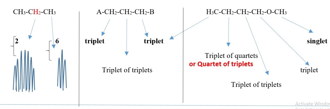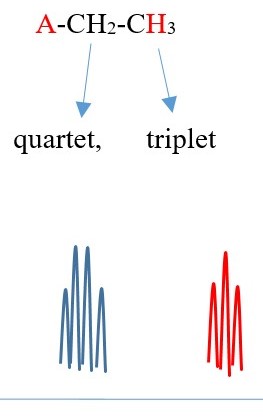 TWO protons near A chemical environment are equivalent and homotopic and interact with the signal of the THREE non-equivalent protons [N=3] on adjacent terminal carbon of different chemical environment to give a multiplicity peak signal of [N+ 1 = 3+1 = 4 ] = QUARTET . However, the THREE terminal protons are also homotopic or equivalent and also sees TWO non-equivalent protons [N=2 ] on adjacent carbon near A chemical environment and the interaction splits the signal peak into a multiplicity peak signal of [N+ 1 = 2+1 = 3]= TRIPLET of a different chemical shift.