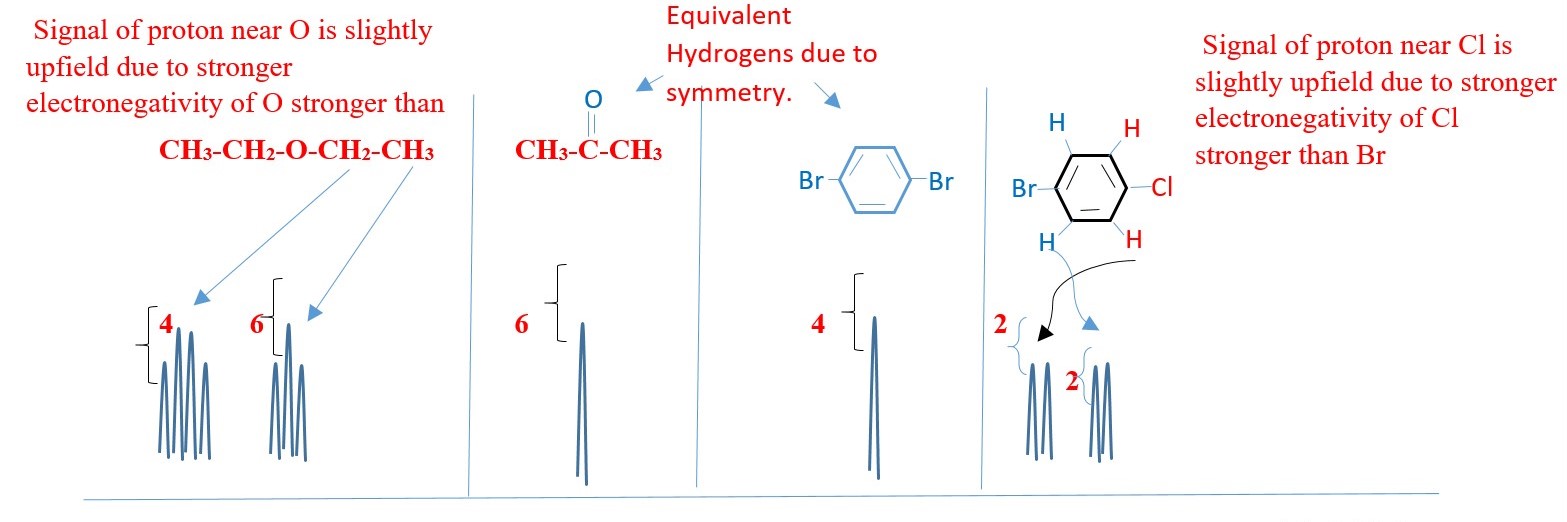In this case, there is no coupling or splitting of signal peaks. Only individual carbons peaks are observed. Carbons in same chemical environment show as one but different if chemical environment is different. Again, shielded carbons give UPFIELD signal peaks, but de-shielded carbons give DOWNFIELD signal peaks.