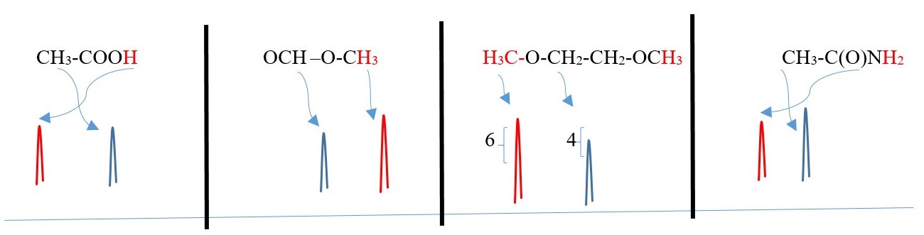 Protons in the structures below will show as single peak or SINGLET in the NMR spectrum because they have no adjacent protons of different chemical environment that will split their peak signals. However, each singlet would appear at a different chemical shift and integrals will equal the number of protons for the singlet peak.