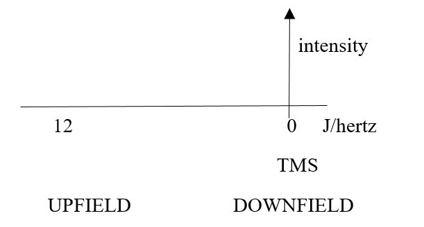 SHIFT: How exposed or shielded a nucleus has been to the external field. This gives the chemical shift number value for the signal position of the element. The peak position on x-axis in NMR spectrum is called a CHEMICAL SHIFT in hertz. [0 to 12].
