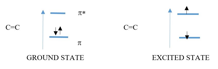 Absorbed energy is used to increase the ROTATIONAL MOTION of the vibrating molecules in UV spectroscopy. Chromophores have broad range of absorption therefore there is a maximum peak of absorption wavelength called λmax in UV spectrum of a molecule. Electrons transitions in C=C Bonds occur in π to π* energy gap HOMO to LUMO.
