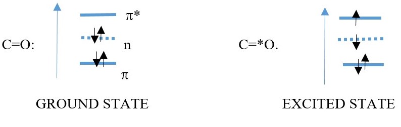 However, carbon bonded to heteroatoms such as Oxygen, a non-bonding lone pair electron can also absorb energy and excite into a LUMO of the C=O: bond, thus a C=O have n to π* transitions. This has lower energy or longer wavelength.